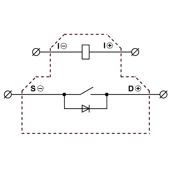 Podstawą złączki jest przetwornica, transformator operacyjny (wejście 40 VDC, wytrzymałość izolacji 1500 VDC), tranzystor mocy (30 V / 2 A), sygnalizacyjna dioda LED, ochronna dwukierunkowa dioda transil do włączania obciążenia indukcyjnego i do modułu z prądem 2 A, ochrona nadmiarowoprądowa (bezpiecznik wielokrotnego użytku).