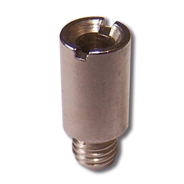 Gniazdo wykonane z mosiądzu, posiada gwintowany trzpień na dole, umożliwiający wkręcenie w środkowy otwór mostka listwy zaciskowej.