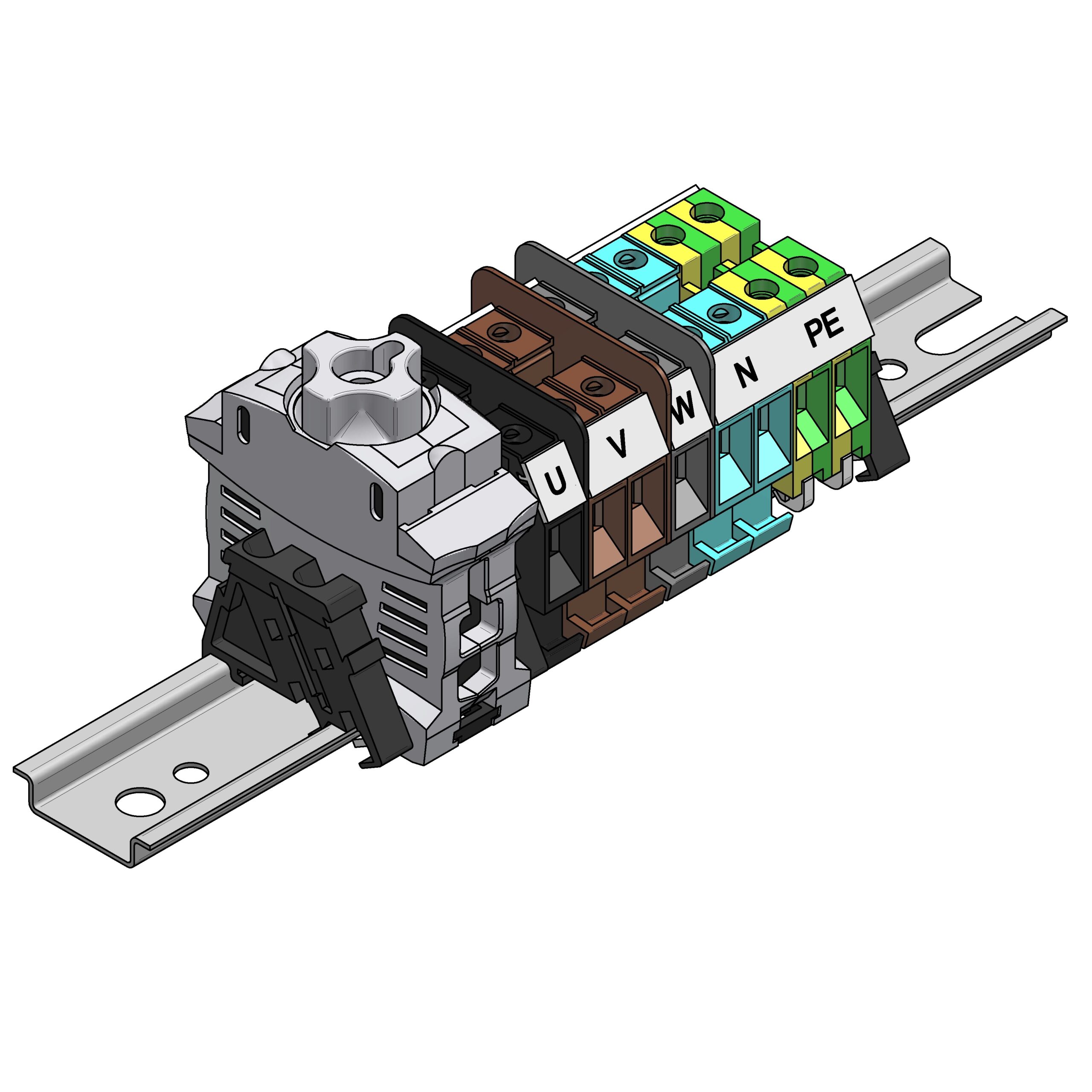 Listwa zaciskowa słupowa SV A 6.10.5 na listwie DIN TH 35 x 7,5 złożona z zacisków szeregowych RSA 10 A z wyposażeniem, stosowana wyłącznie w układzie TN-C, TN-S.