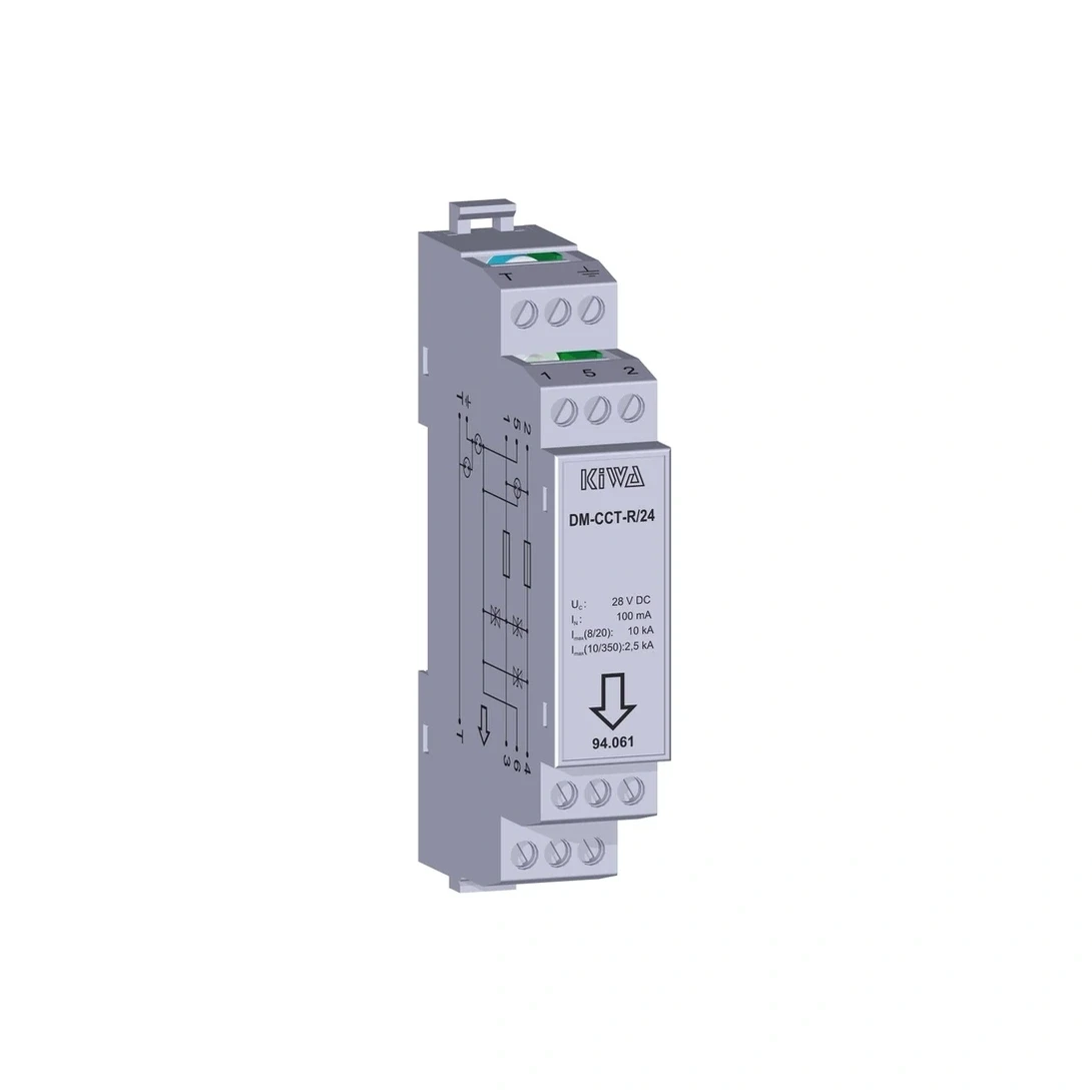 Ogranicznik przepięć dla urządzeń pomiarowych i regulacyjnych DM-CCT-R/24V/100mA Posiada napięcie znamionowe 24 V DC, a maksymalne napięcie trwałej pracy wynosi 28 V DC. Prąd maksymalny upływu (10/350) wynosi 2,5 kA. Czas reakcji dla przewodu uziemiającego z linią/ziemią/obudową wynosi ≤ 100 ns. Częstotliwość graniczna / prędkość