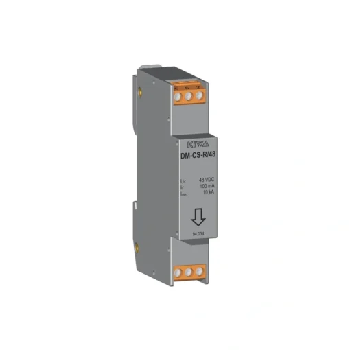 Ogranicznik przepięć dla urządzeń pomiarowych i regulacyjnych DM-CS-R/48V/100mA. Posiada napięcie znamionowe 34 V AC oraz 48 V, a maksymalne napięcie trwałej pracy wynosi 39,1 V AC oraz 55,2 V DC. Poziom ochrony napięciowej dla 1 kV/µs linia / ziemia wynosi ≤ 450 V. Czas reakcji linia (ziemia) / ziemia to ≤ 100 ns. Częstotliwość graniczna/prędkość połączenia wynosi 3 MHz / 1,5 MBit/s. Impedancja wzdłużna / linia to max. 10 Ω.