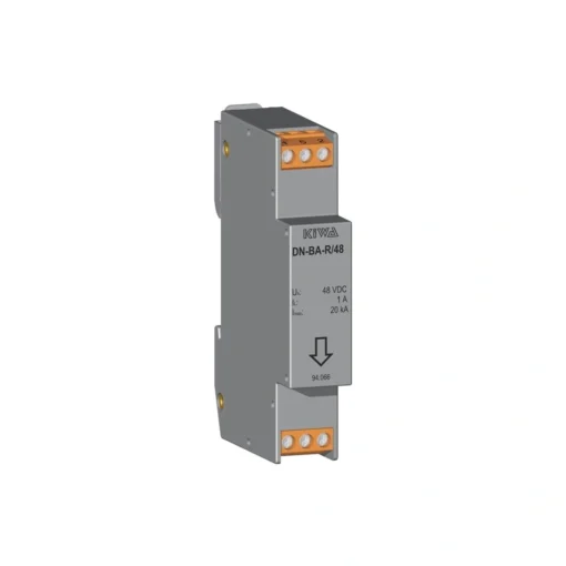 Ogranicznik przepięć dla urządzeń pomiarowych i regulacyjnych DN-BA-R/48V. Posiada napięcie znamionowe 48 V DC, a maksymalne napięcie trwałej pracy wynosi 55,2 V DC. Oporność liniowa wynosi max. 250 µH / max. 2 Ω. Częstotliwość graniczna to 70 kHz. Ochronnik przepięciowe klasy DN (zasilanie) jest przeznaczony do zabezpieczania wejść (portów) w systemach pomiarowych i regulacyjnych, które zwykle są bardzo podatne na uszkodzenia na skutek przepięć.