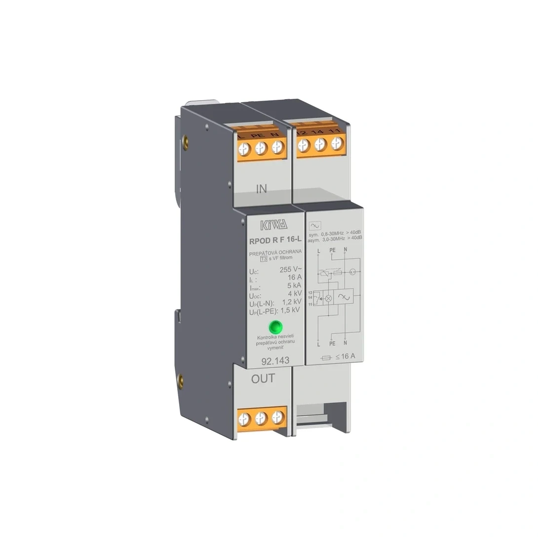 Ogranicznik przepięć RPOD R F 16-L 1P Typ 3 1,2kV 230V (zdalna sygnalizacja stanu, warystor zestawiony z iskiernikiem, filtr wyższych harmonicznych – ochrona przed wysoką częstotliwością)