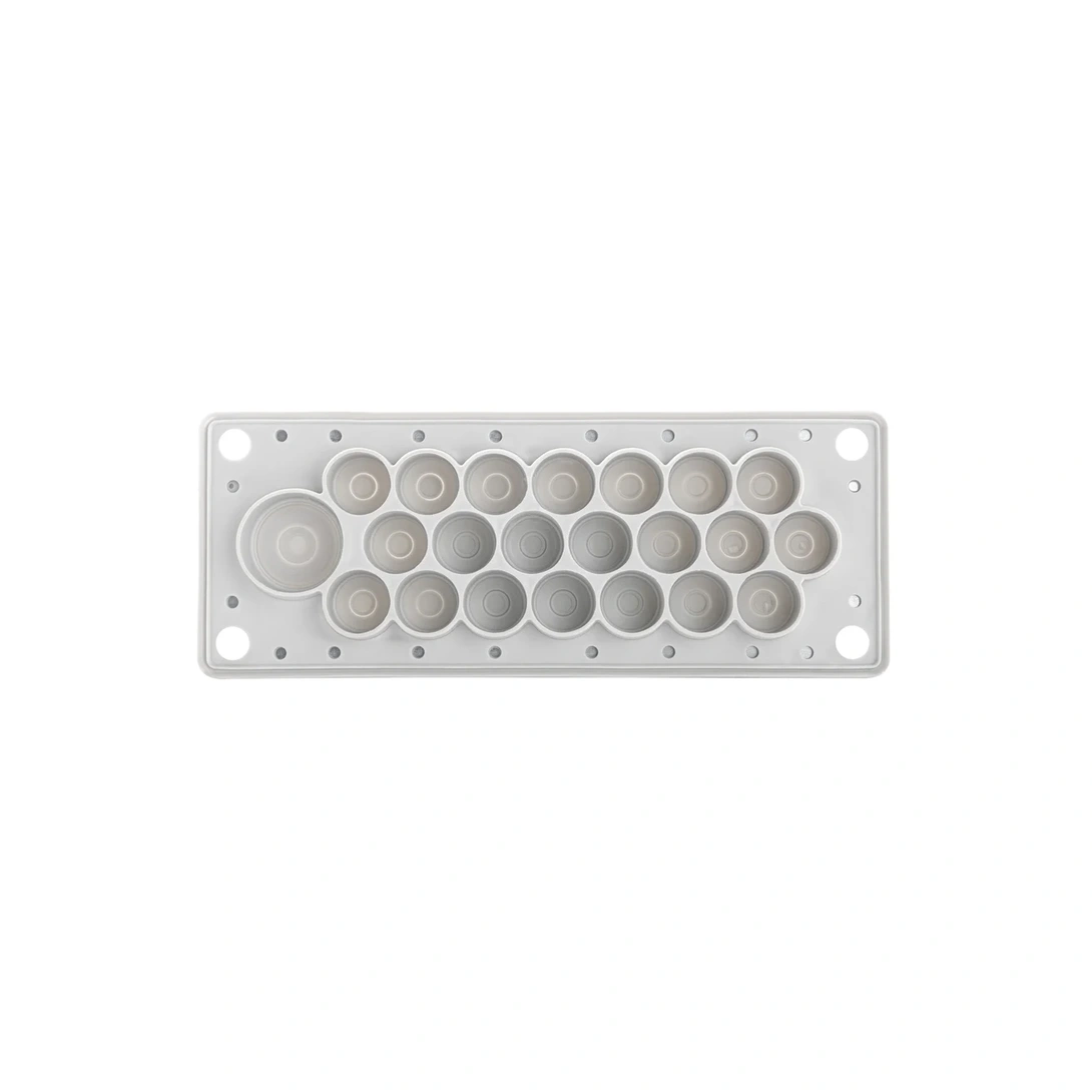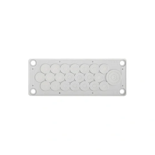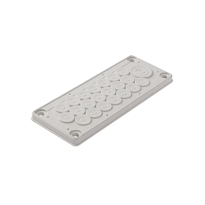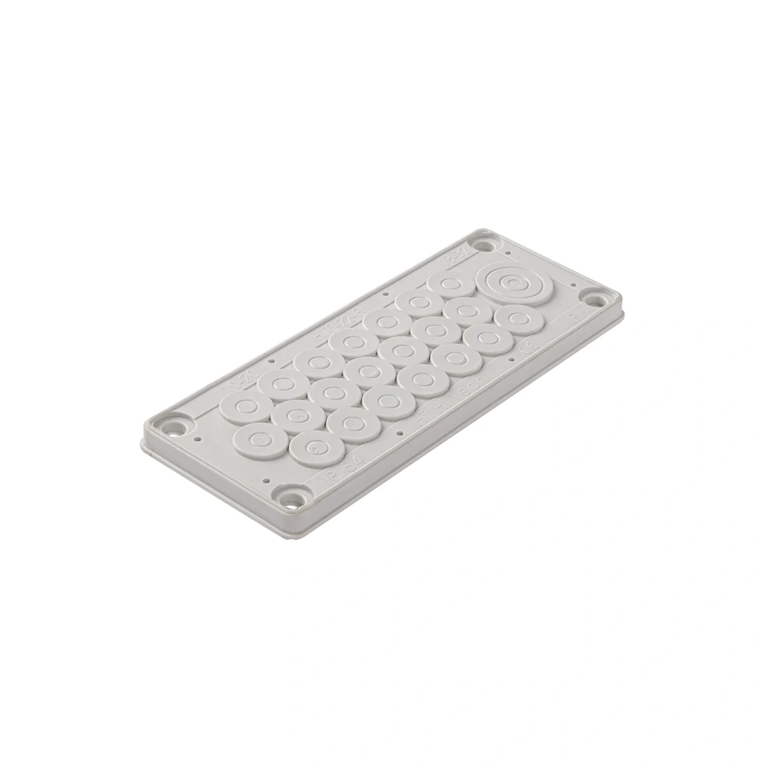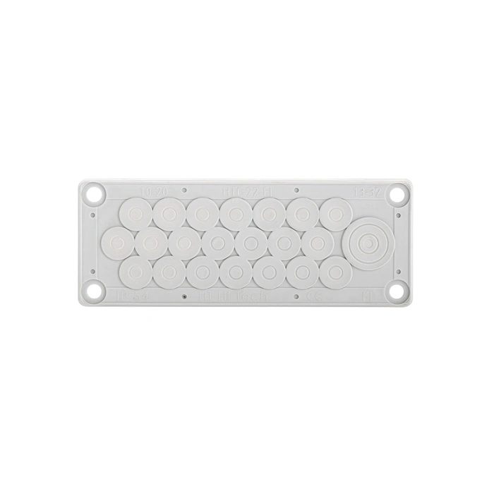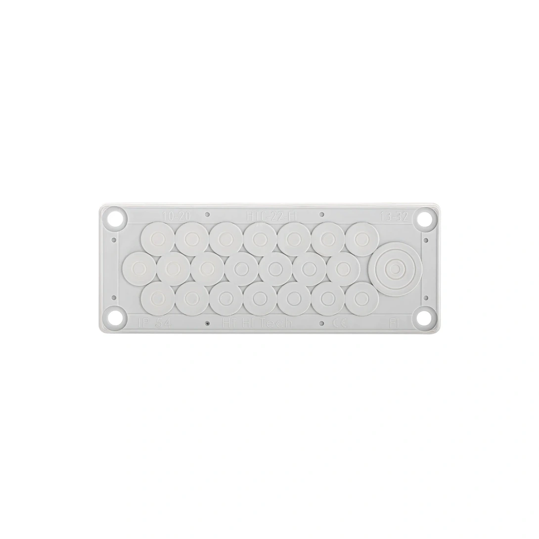 HTC-22-FI (Typ FL21) IP54 służy do szczelnego i bezpiecznego wprowadzania kabli do urządzeń elektrycznych, koryt instalacyjnych bądź rozdzielnic. Przepust częściowo usztywnia przeprowadzany odcinek kabla, ograniczając możliwość uszkodzeń mechanicznych. Zabezpiecza izolację przewodu przed przecięciem. Dodatkowo utrudnia lub uniemożliwia wyrwanie przewodu z wnętrza urządzenia. Wykonany z wytrzymałego tworzywa sztucznego w kolorze szarym. Produkt charakteryzuje się wysoką odpornością na poziomie IP54. Posiada 22 otwory podłączeniowe, dla przewodów o wymiarach 1 x 10 mm – 32 mm / 21 x 10 mm – 20 mm. Przepust jest odporny na temperatury w zakresie -40 – 100 °C.